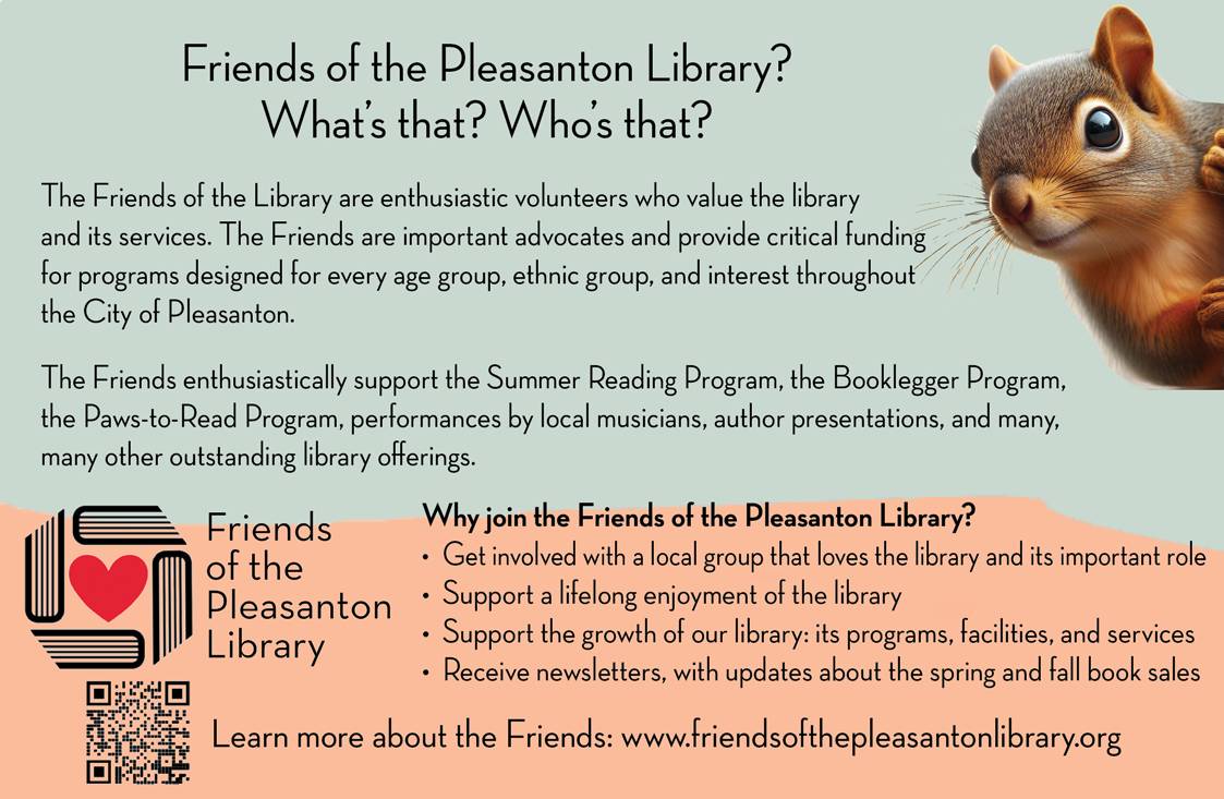 The Friends of the Pleasanton Library is a non-profit, grassroots organization dedicated to promoting our library as an essential institution of society and supporting its mission and vision.